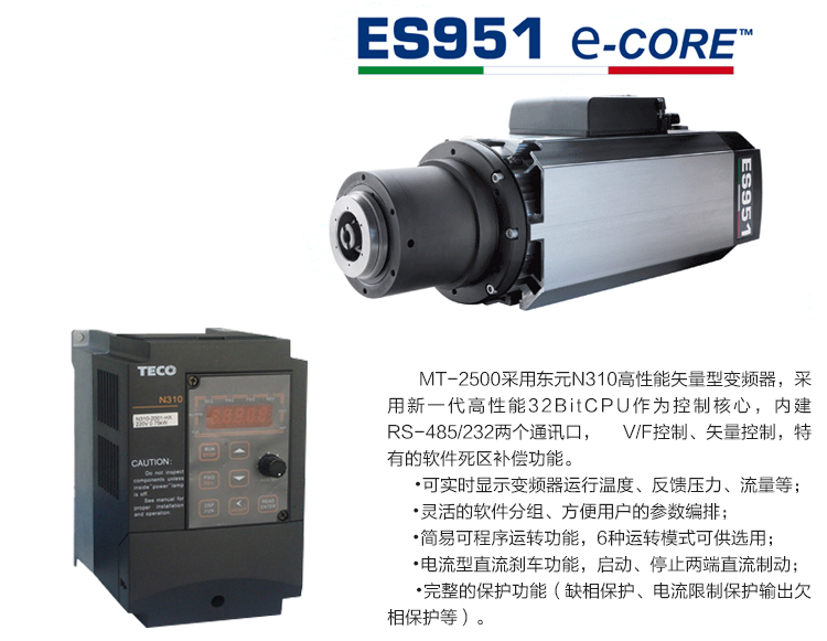 MT-2500标配采用5.5Kw国产高精换刀水冷主轴,或选配意在利HSD9.0Kw高精换刀水冷主轴, 具有精度高、高速度、低跳动、恒扭矩,力量大静音的特点。