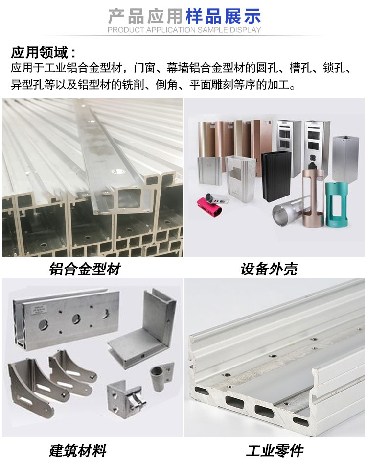 ■适用于工业铝合金型材,门窗、幕墙铝合金型材的圆孔、槽孔、锁孔、异型孔等以及铝型材的铣削、倒角、平面雕刻等序的加工。