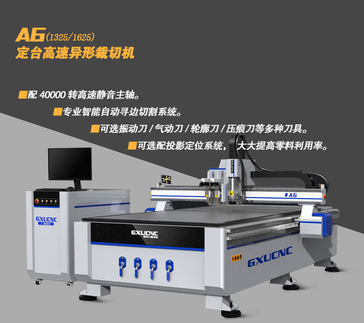 广旭A6切割机主要针对非金属柔件材料异形裁切,采用乐宇寻边切割软件及智能套料排版软件,配置振动刀、气动刀、轮切刀、压痕刀、绘画笔、铁刀等多样化刀具可快速完成全切、半切、镂铣、打孔、折痕、标记、识别轮廓裁切等各类工艺,解决异形图画裁剪难题。