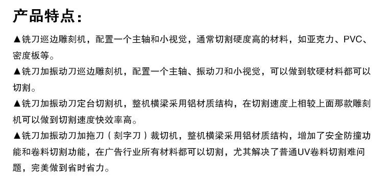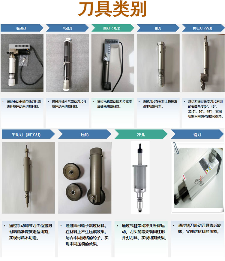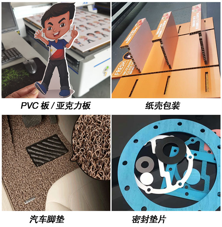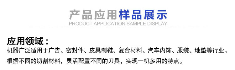 机器广泛适用于广告、密封件、皮具制鞋、复合材料、汽车内饰、服装、地垫等行业。根据不同的切割材料,灵活配置不同的刀具,实现一机多用的特点。