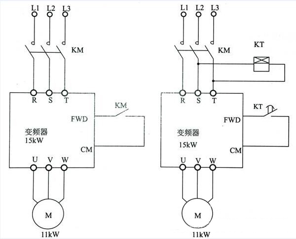 故障处理:按图1B进行改进,增加一只时间继电器KT,用其延时闭合的常开触点,替代图1A中KM的辅助常开触点。这样主回路提前得到电源电压,延时2-3s以后,FWD端子才得到启动信号,保证了变频器的可靠启动。