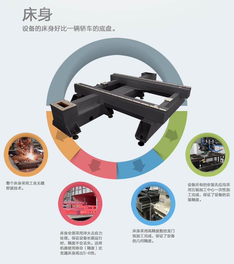 采用定柱式框架龙门,台面移动的传动模式,工业重载钢结构设计,严格按照要求退火去应力处理,